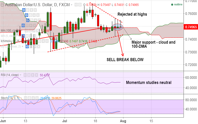 - Immediate resistance is seen by 21-DMA at 0.7523, break above will find next major hurdle at 0.7550 (trendline).