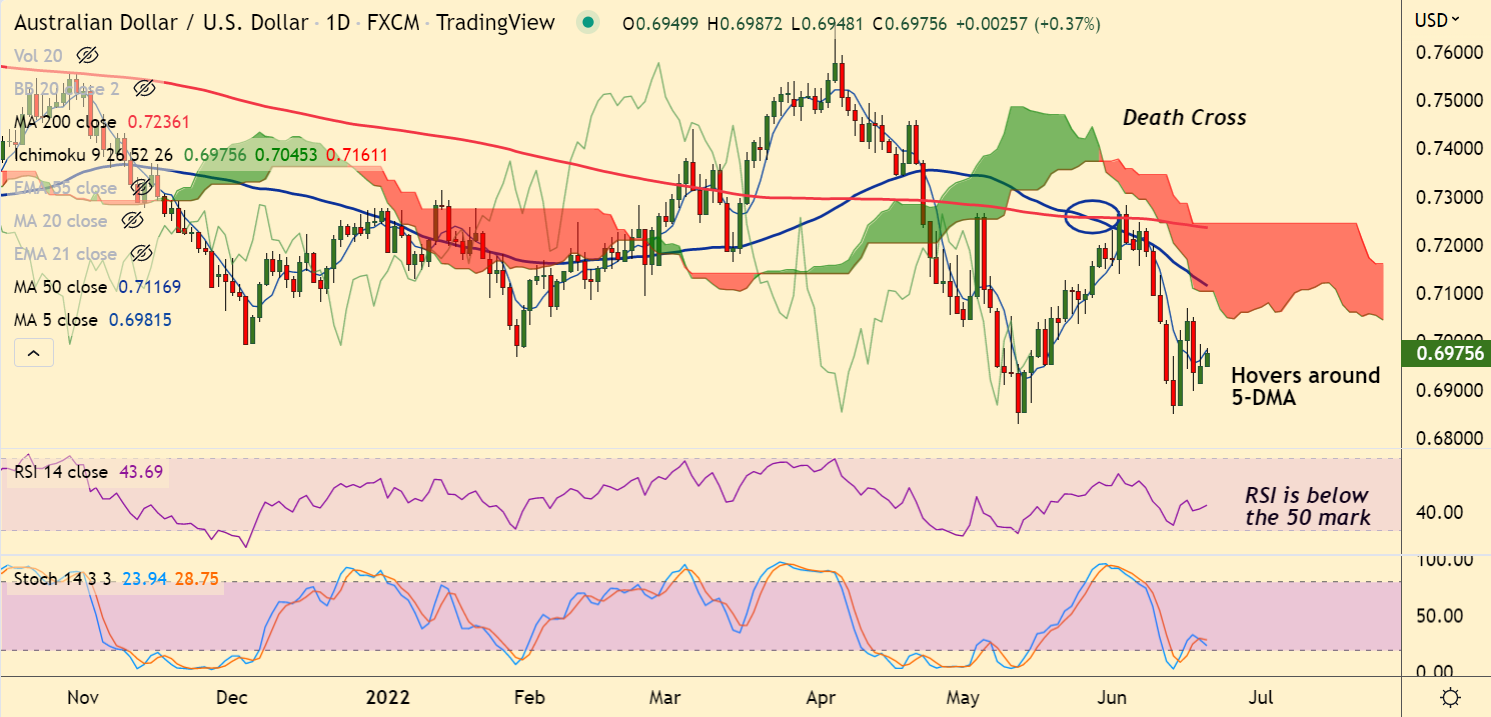 Summary: AUD/USD was trading with a major bearish bias, with signs of minor bullishness on the intraday charts. 21-EMA is major resistance at 0.7050, any bullish continuation only on break above.