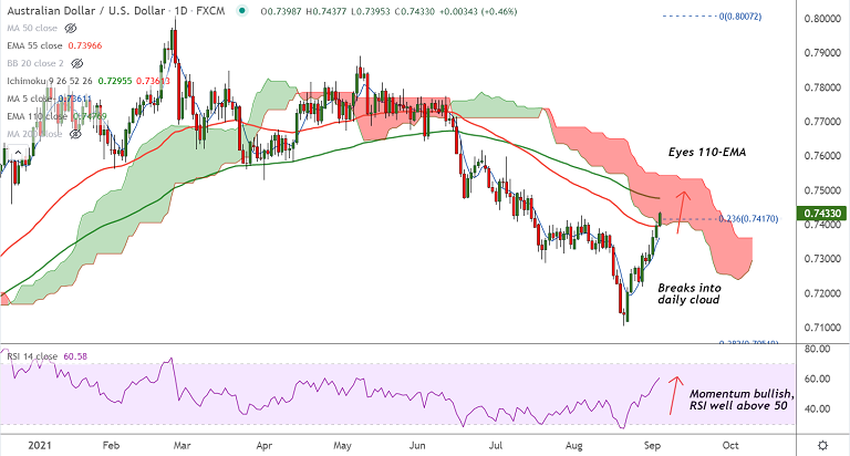 The pair breaks 55-EMA resistance to enter into the daily cloud, raising scope for further upside.