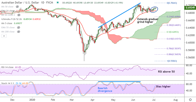 AUD/USD was trading 0.21% higher on the day at 0.6936 at around 06:40 GMT, bias remains bullish.