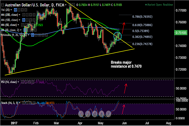 Resistance levels - 0.7454 (5-DMA), 0.75 (psychological level), 0.7540 (200-DMA), 0.7588 (61.8% Fib)
