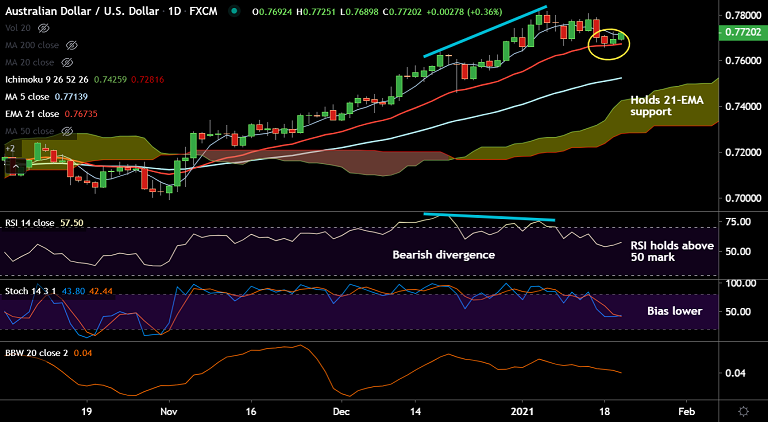 Major trend is bullish. Pullbacks in the pair have held above 21-EMA support raising scope for further upside. Next bull target lies at 0.7836 (88.6% Fib). Weakness only below 21-EMA.