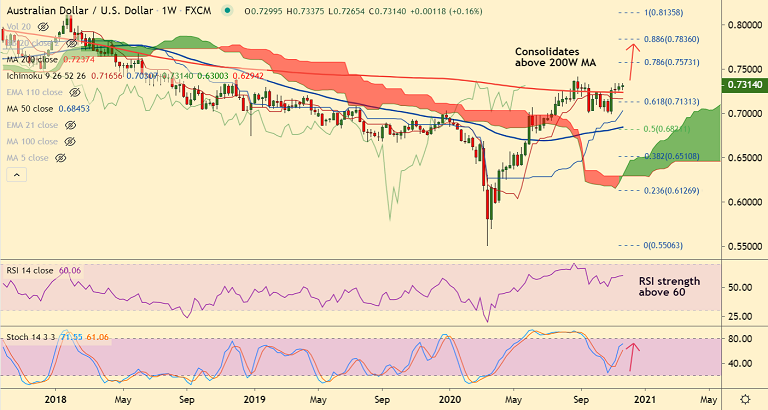 Price action is consolidating above 200W MA and daily cloud and holds above major moving averages. Major and minor trend are bullish. Momentum indicators are biased higher, volatility is rising and resumption of upside will see test of 78.6% Fib at 0.7573. Daily cloud offers strong support. Break below will see weakness in the pair. Supports align at 0.7190 (55-EMA), 0.6963 (23.6% Fib), 0.6844 (200-DMA).