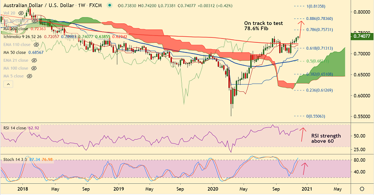 Immediate support is seen at 5-DMA at 0.7381. Retrace below daily cloud will see major weakness. Bullish invalidation only below 200W MA.