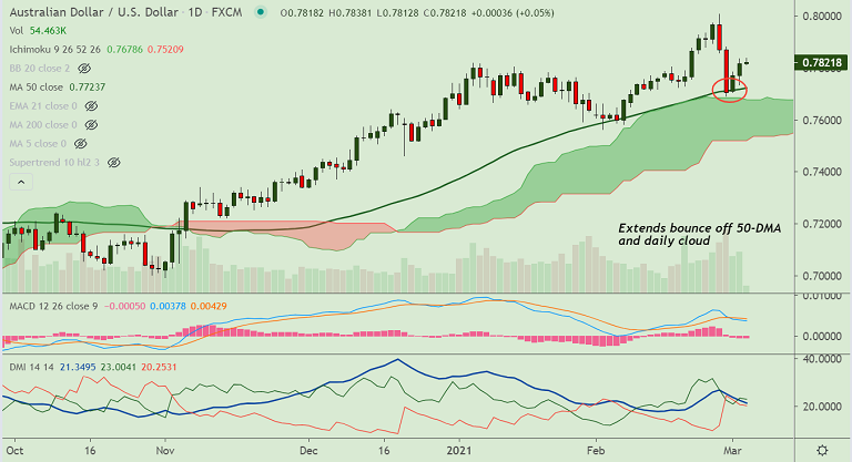 Technical indicators also indicate a bullish continuation. Retrace has bounced off daily cloud and 50-DMA support