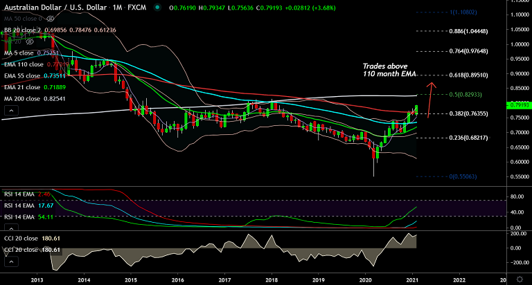 Overbought pressure may cause minor pullbacks in the pair. But uptrend remains intact as long as prices hold above 110 month EMA. Scope for gains till 200 month MA at 0.8254.