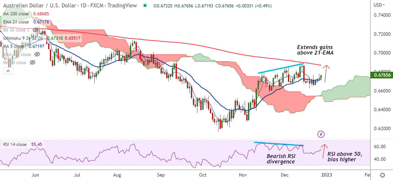 Summary: AUD/USD trades with a bullish bias. Scope for further upside, 200-DMA in sight. Bullish invalidation only below 55-EMA.
