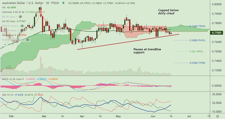 Technical bias for the pair is tilted towards the bears. Strong support is seen around 0.7670 (nearly converged trendline and 110-EMA). Break below will drag the pair lower.