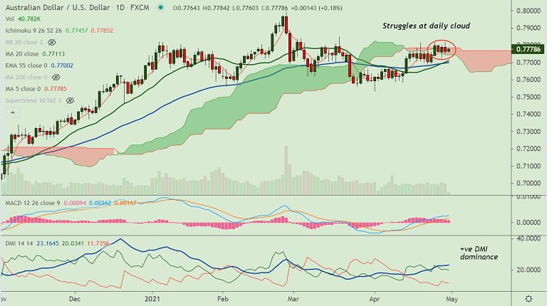 AUD/USD struggles at daily cloud top, but indicators hold a slightly bullish bias. Breakout of daily cloud will boost upside in the pair.