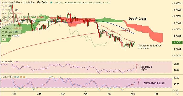 AUD/USD was trading 0.12% higher on the day at 0.7402 at around 05:30 GMT, outlook bullish.