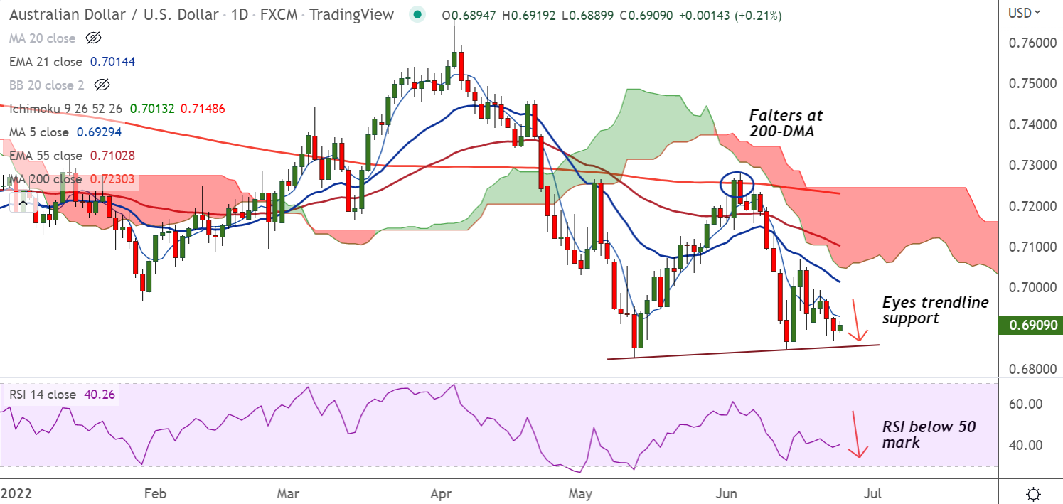 Summary: AUD/USD recovery lacks traction. Scope for downside resumption, trendline support at 0.6855 in sight.