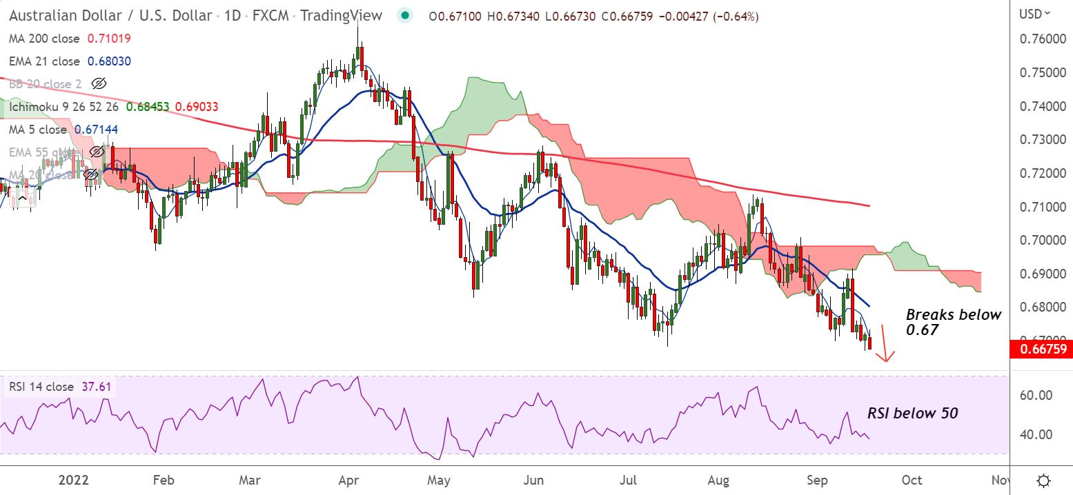 AUD/USD was trading 0.65% lower on the day at 0.6674 at around 09:30 GMT, outlook bearish.