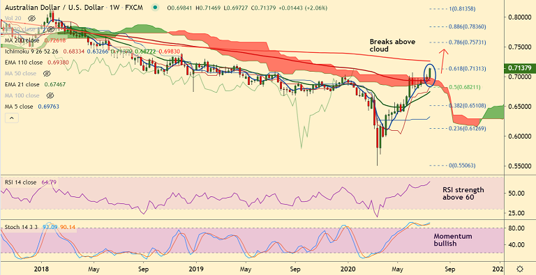 Price action has broken above weekly cloud and bulls are on track to test 200W MA at 0.7261.