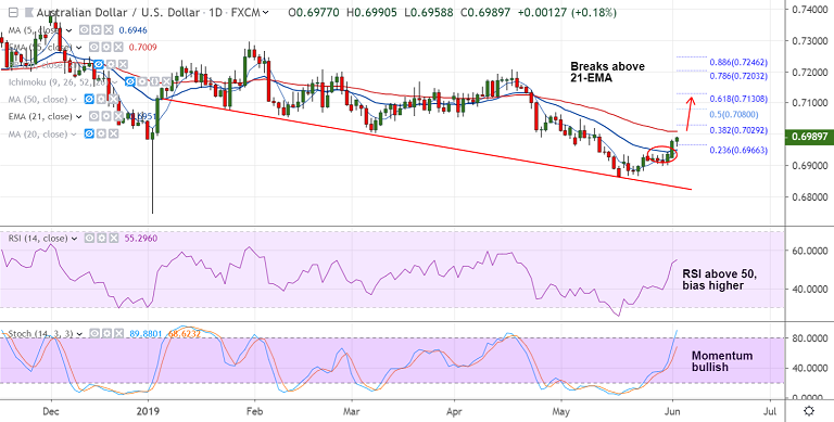 Upside was capped at 4H 200-SMA at 0.6983. Decisive break above to see gains till 0.7127 (200-DMA).