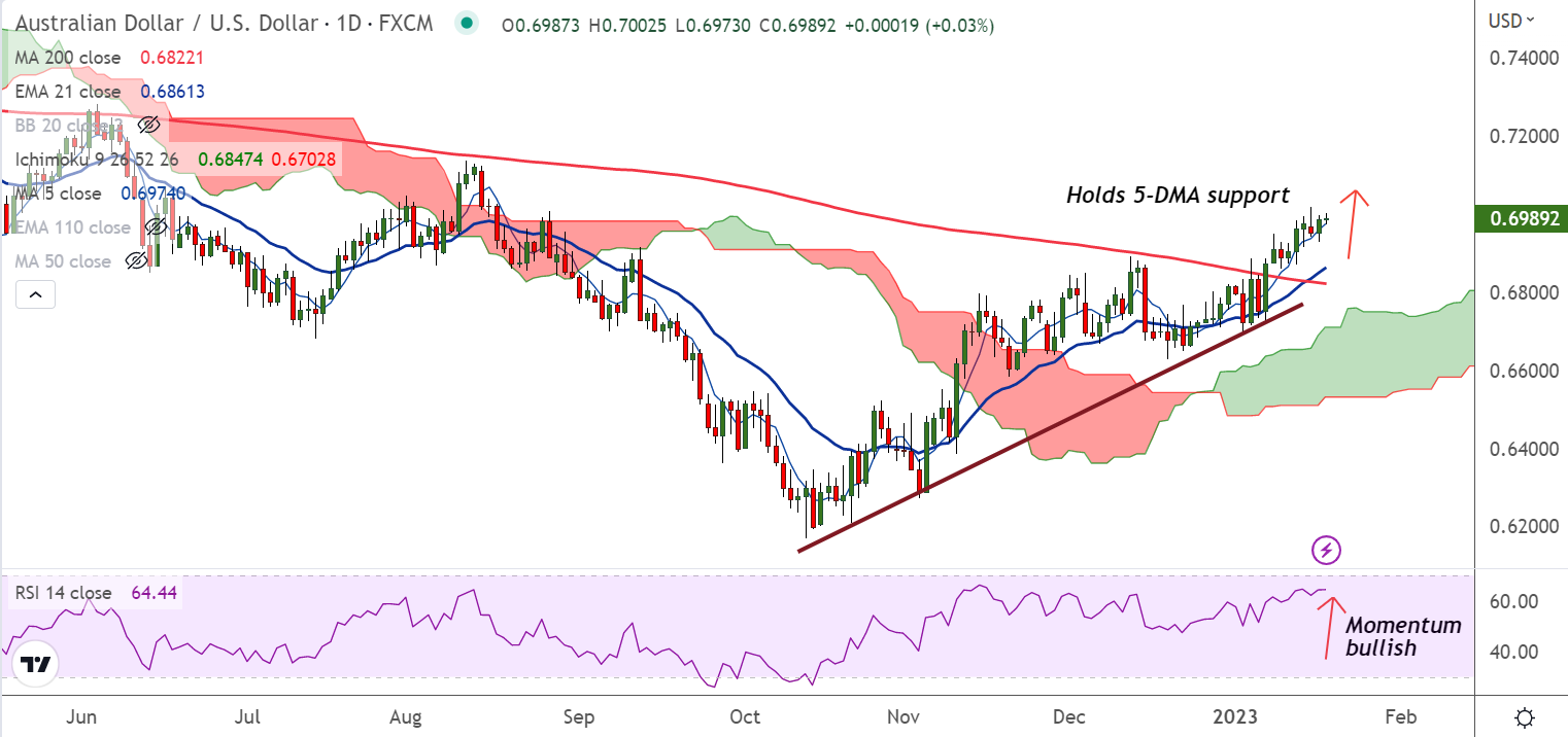 Support - 0.6973 (5-DMA), Resistance - 0.7035 (110-week EMA)