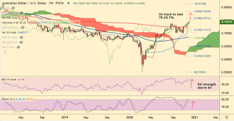 5-DMA is immediate support at 0.7397 ahead of 21-EMA at 0.7324. Bullish invalidation only below 200W MA.