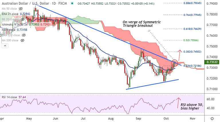 AUD/USD was trading 0.20% higher on the day at 0.7357 at around 05:40 GMT, outlook is bullish.