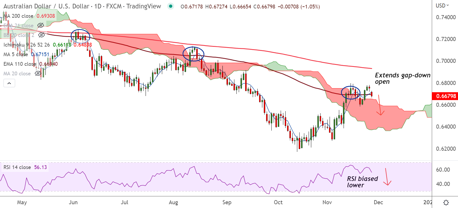 AUD/USD price action has slipped below 200H MA. The pair finds major support at daily cloud, break below cloud top will see more weakness.