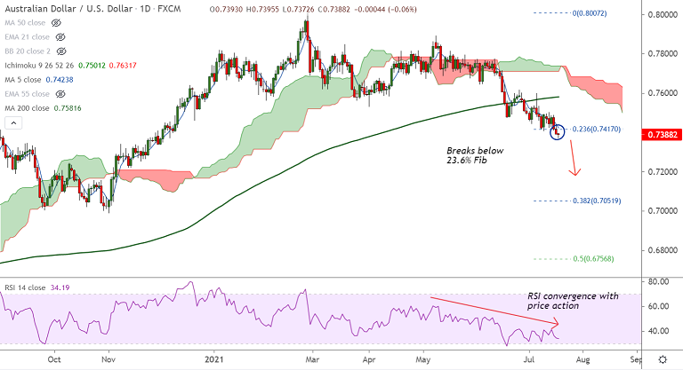 Price action has slipped below 0.74 handle, is extending weakness below 23.6% Fib. Scope for test of 110-week EMA at 0.7306.