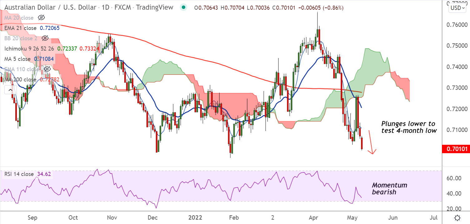 Summary: AUD/USD trades with a strong bearish bias. Scope for fresh yearly lows below 0.6967.