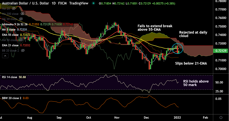 Price action has slipped below 21-EMA and is hovering around 20-DMA support at 0.7187. Break below 20-DMA will see more downside. Next major support lies at 200-week MA at 0.7173.
