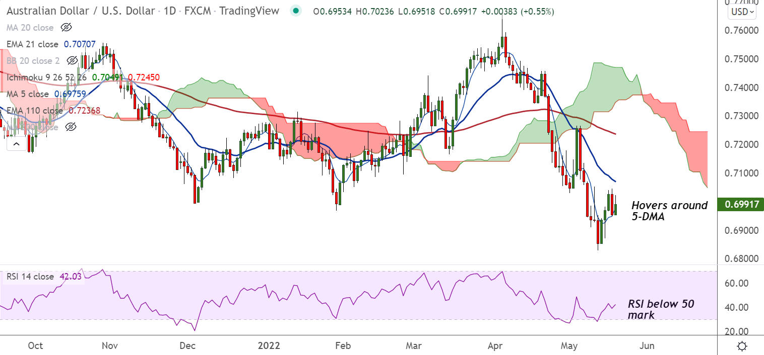 - Stiff resistance seen upto 0.7070, 20-DMA and 21-EMAs, break above could change near-term dynamics