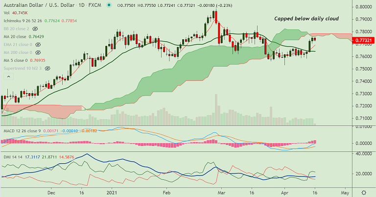 AUD/USD has paused upside after 4 straight sessions of gains. Daily cloud is seen as stiff resistance.