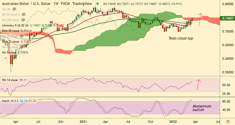 Support - 0.7452 (5-DMA), Resistance - 0.75 (Weekly cloud top)