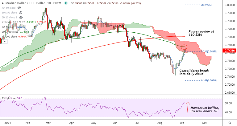 AUD/USD was trading 0.27% lower on the day at 0.7430 at around 04:55 GMT, pauses upside at 110-EMA resistance.