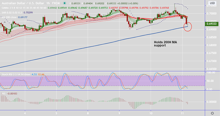 Summary: The pair has slipped below 5-DMA and technical indicators are turning bearish on the intraday charts. Price action is holding support at 200H SMA at 0.6918, break below will see major weakness.