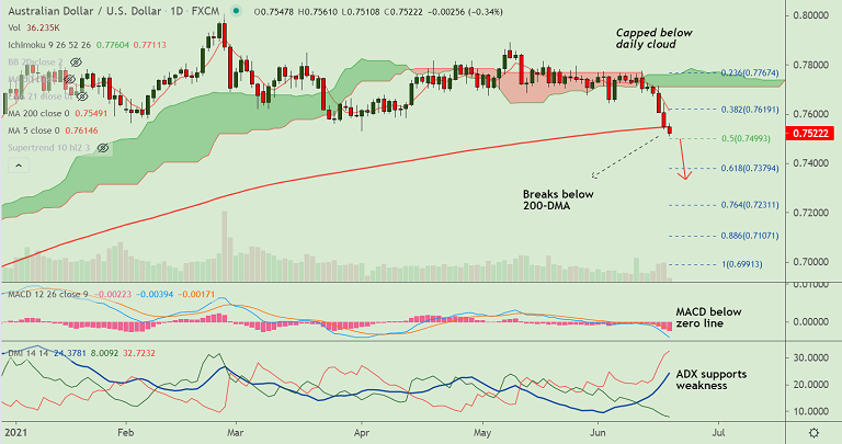 MACD and ADX support weakness. Close below 200-DMA will open downside for the pair. Scope for test of 61.8% Fib at 0.7379.