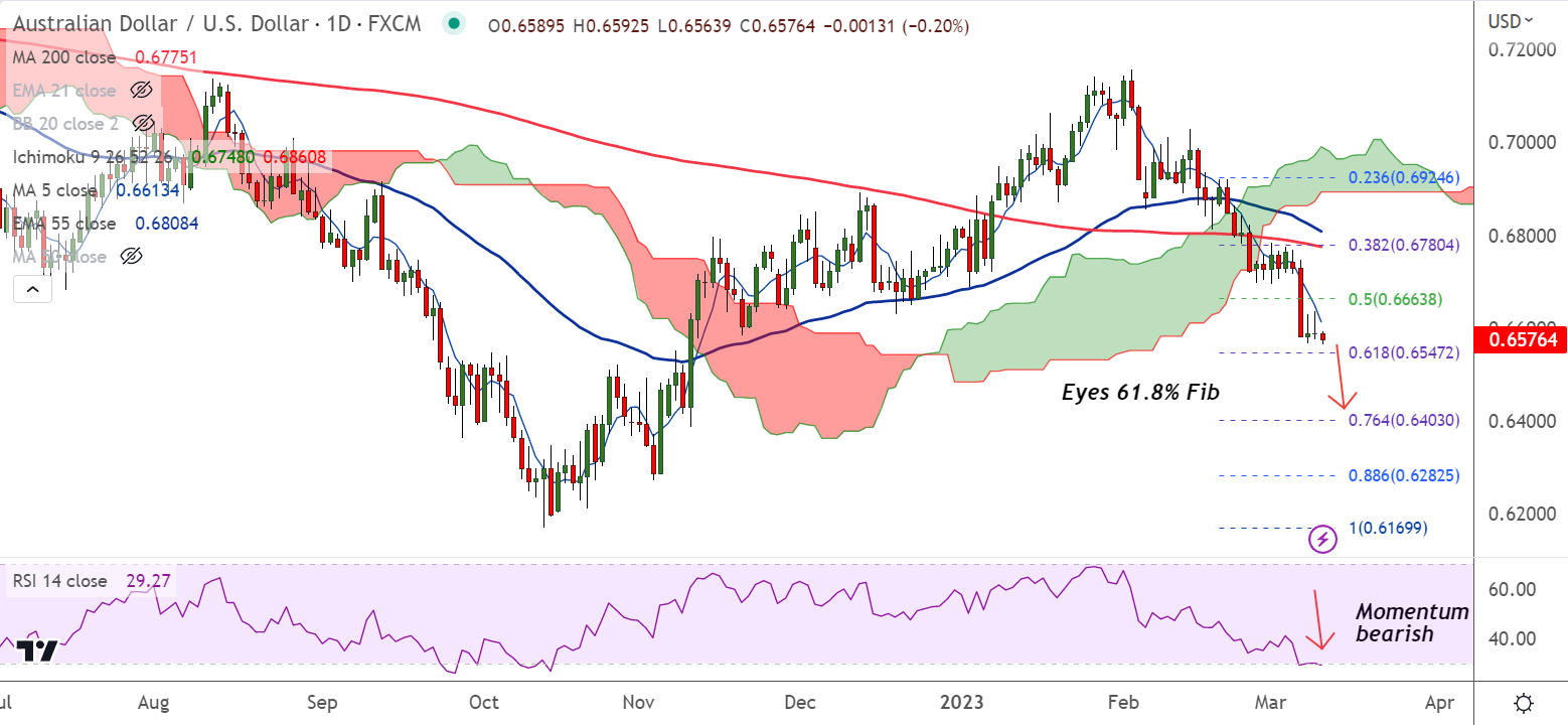 Summary: AUD/USD trades with a bearish technical bias. Bears on track to test 61.8% Fib support at 0.6547.