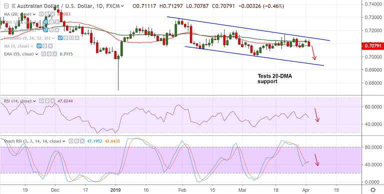 - Major trend in the pair is bearish. Break below 20-DMA (0.7083) will see resumption of weakness.