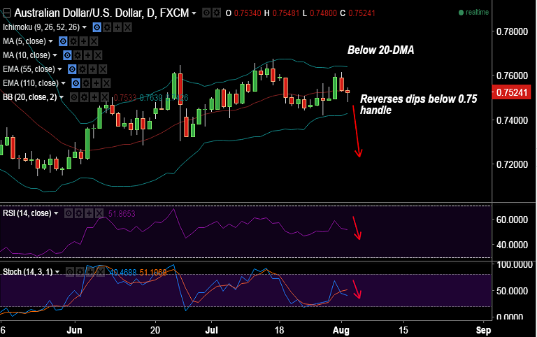 - The pair has quickly reversed the dip to trade around 0.7520 levels, finds stiff resistance at 1H 20-SMA at 0.7550.