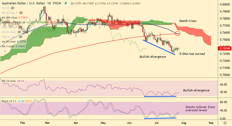 The pair hovers around 200H MA and remains capped below the 0.74 handle. Decisive break above 0.74 required for upside continuation.