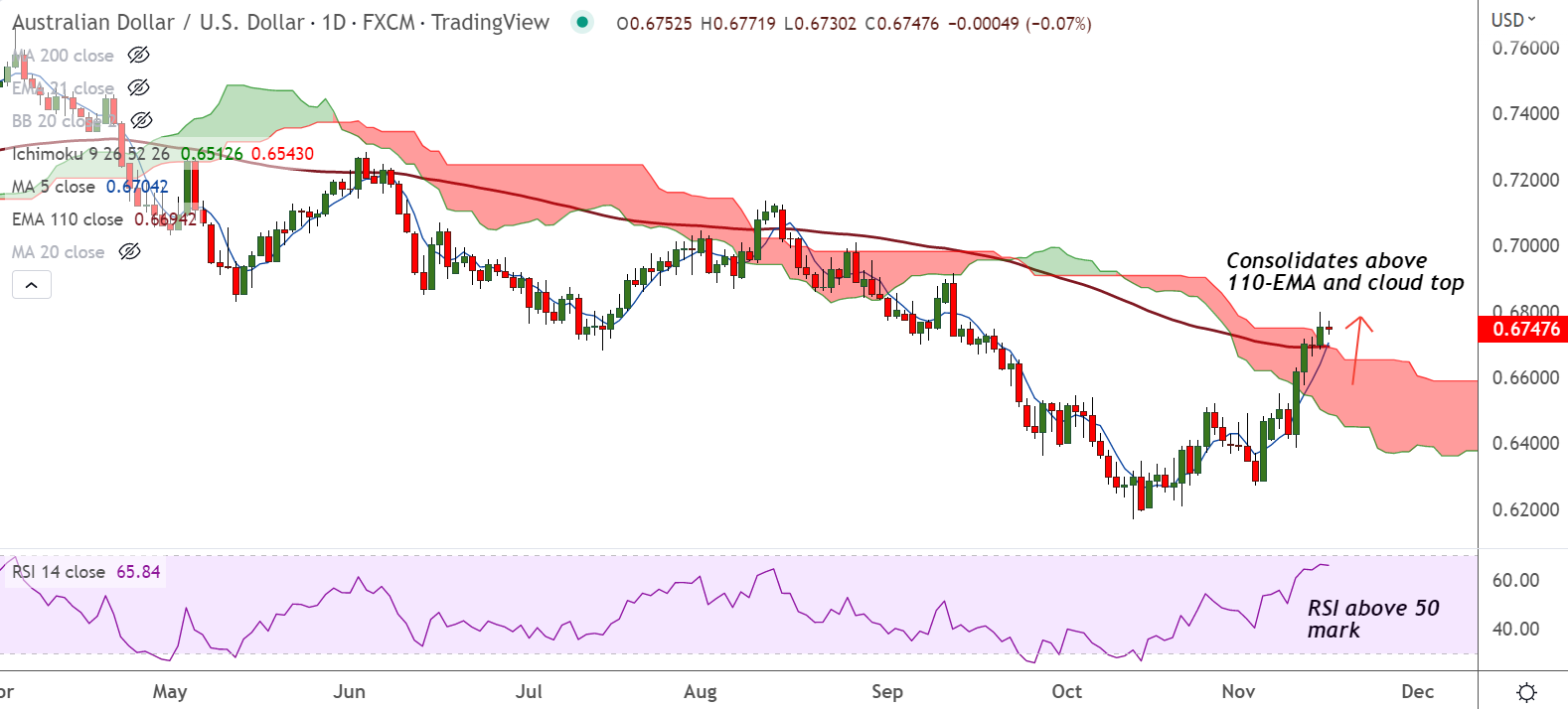 The pair is consolidating break above 110-EMA and daily cloud, scope for further gains.