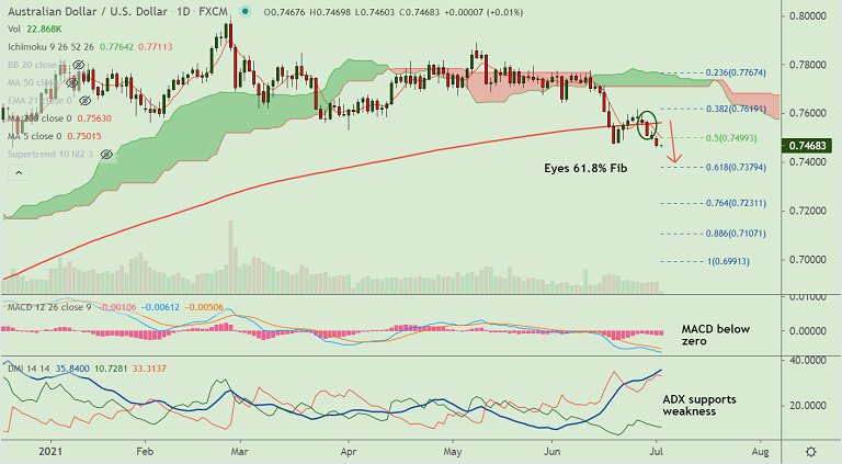 Summary: AUD/USD rangebound ahead of key US payrolls data. The major trades with a bearish technical bias. Break below 200-DMA has reinforced weakness in the pair. Scope for test of 61.8% Fib at 0.7379.