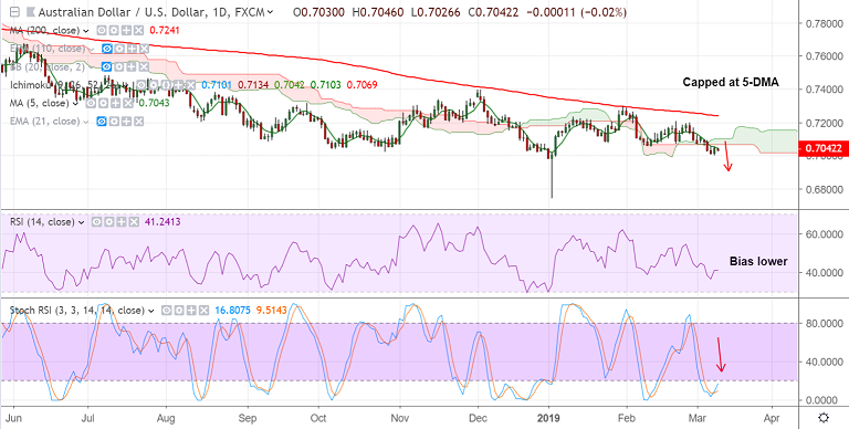 - Technical indicators on the daily charts are bullish. Daily cloud caps upside for now. Break above can see gains upto 20-DMA at 0.7103.