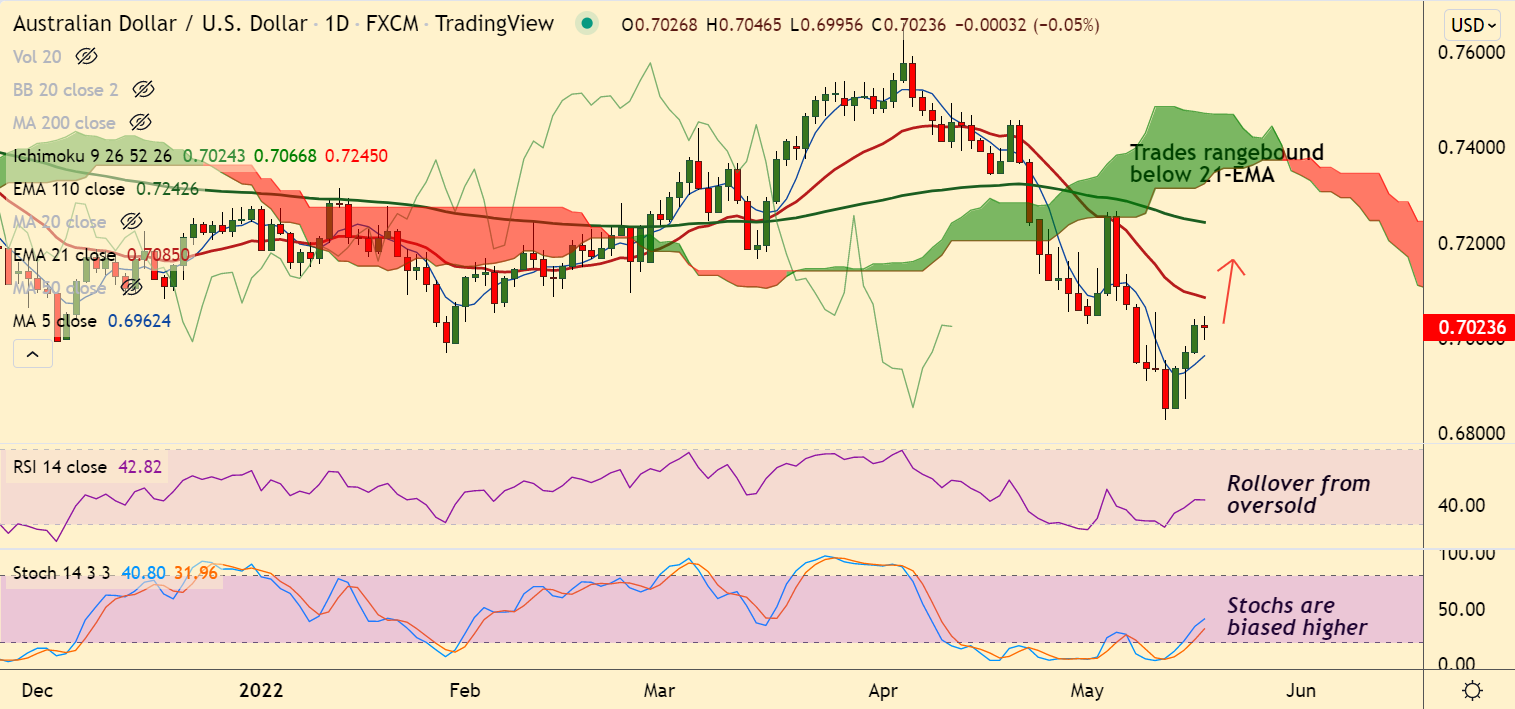 Summary: AUD/USD major trend remains bearish, but signs of minor bullishness seen on the intraday charts. Scope for test of 21-EMA at 0.7084.