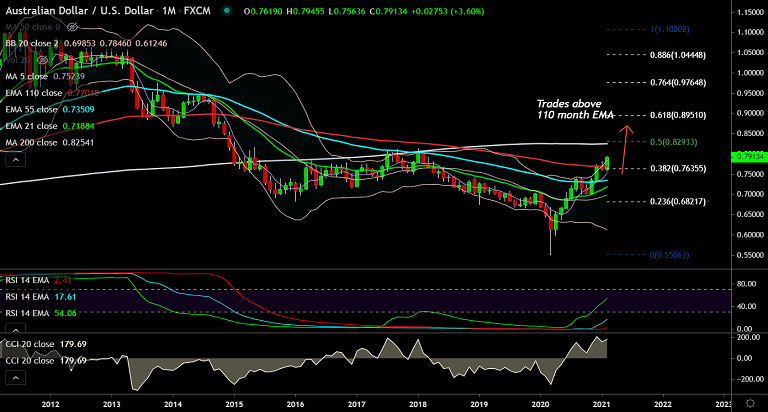 Price action has broken above 110 month EMA and holds scope for test of 200 month MA at 0.8254.