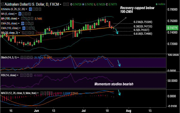 - Upside finds stiff resistance at 100-DMA 0.7485 and then 20-DMA at 0.7507. Bearish invalidation only on breaks above 20-DMA.