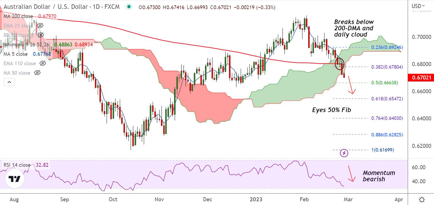 Summary: AUD/USD trades with a bearish technical bias. Close below 200-DMA and daily cloud has opened downside. Scope for test of 61.8% Fib at 0.6547.