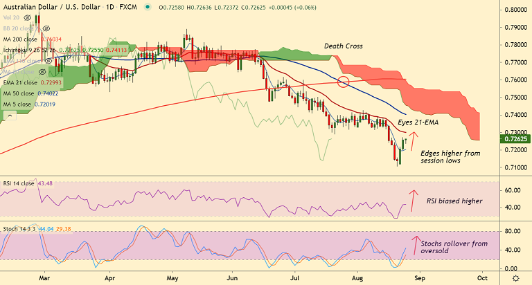 AUD/USD technical bias is turning bullish on the intraday charts. Price action is above 200H MA and the pair is on track to test 21-EMA at 0.7299.