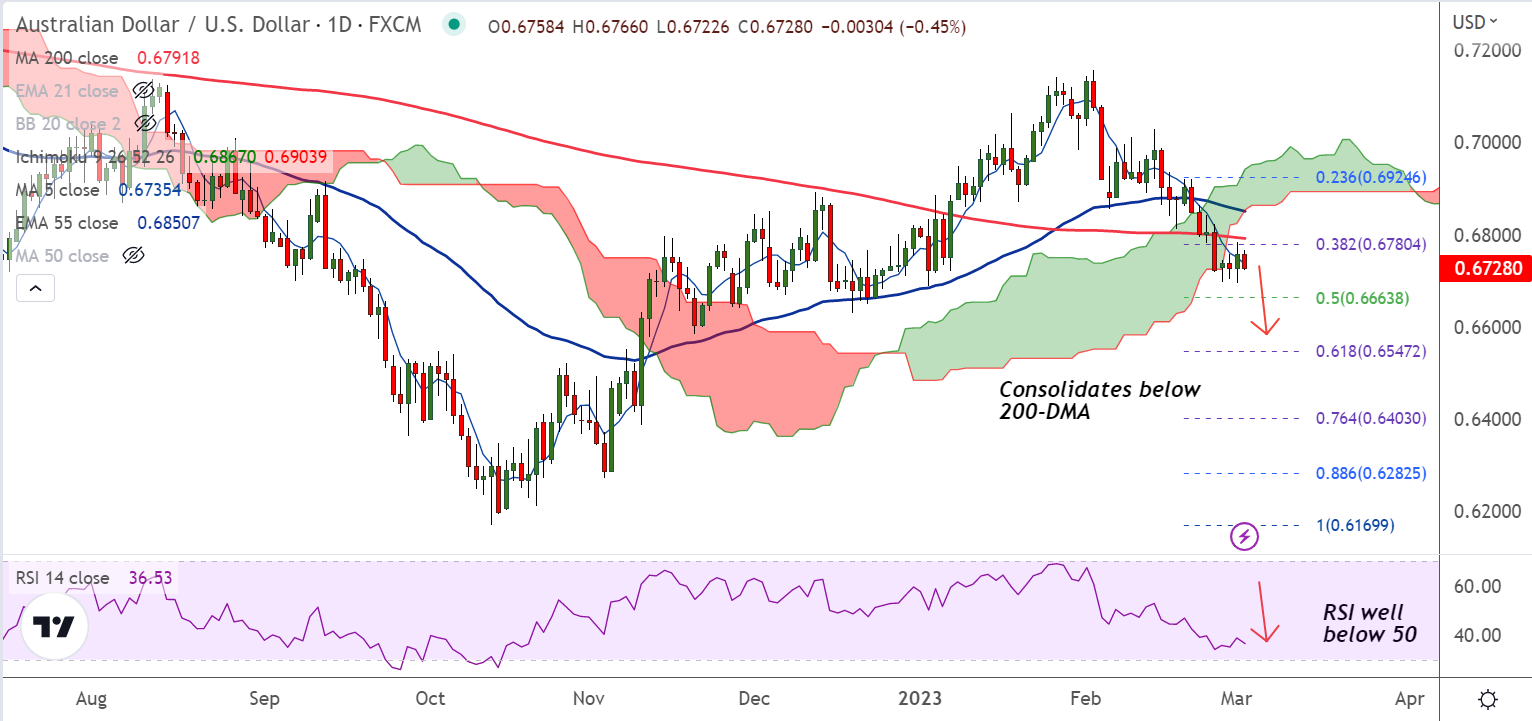 Summary: AUD/USD is extending choppy trade below 200-DMA. Technical bias remains bearish. Scope for more weakness. Bearish invalidation only above daily cloud.
