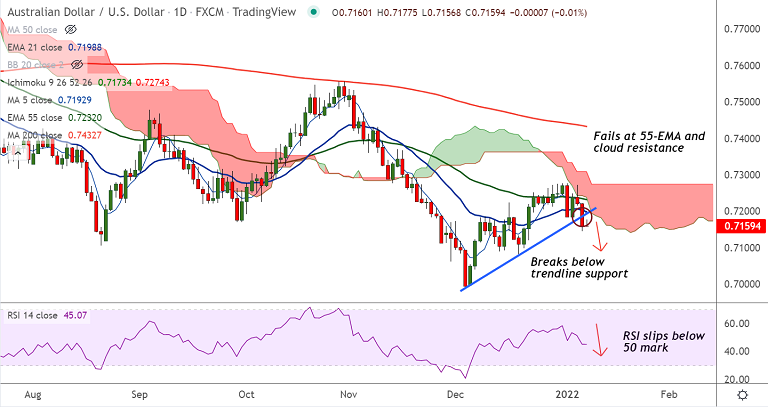 Summary: AUD/USD trades with a bearish bias. The pair has slipped lower from session highs at 0.7177 and is on track for further downside. Scope for test of 38.2% Fib.