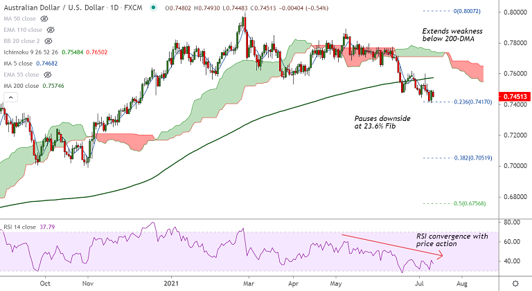 On the weekly charts, 55-EMA is offering strong support at 0.7452, break below will drag the pair lower.