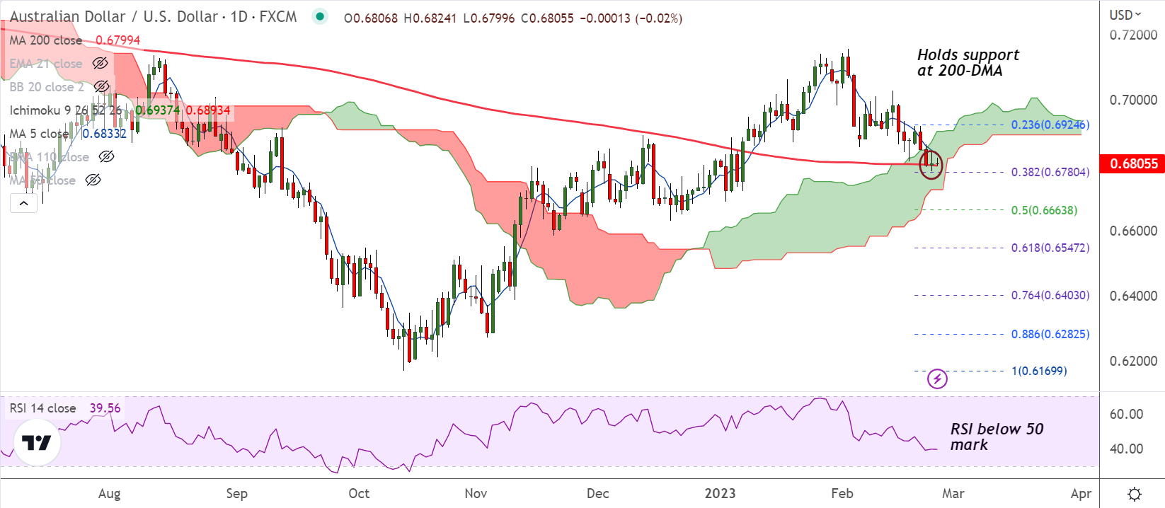 Summary: AUD/USD trades with a bearish bias. Watch out for break below 200-DMA for further downside.