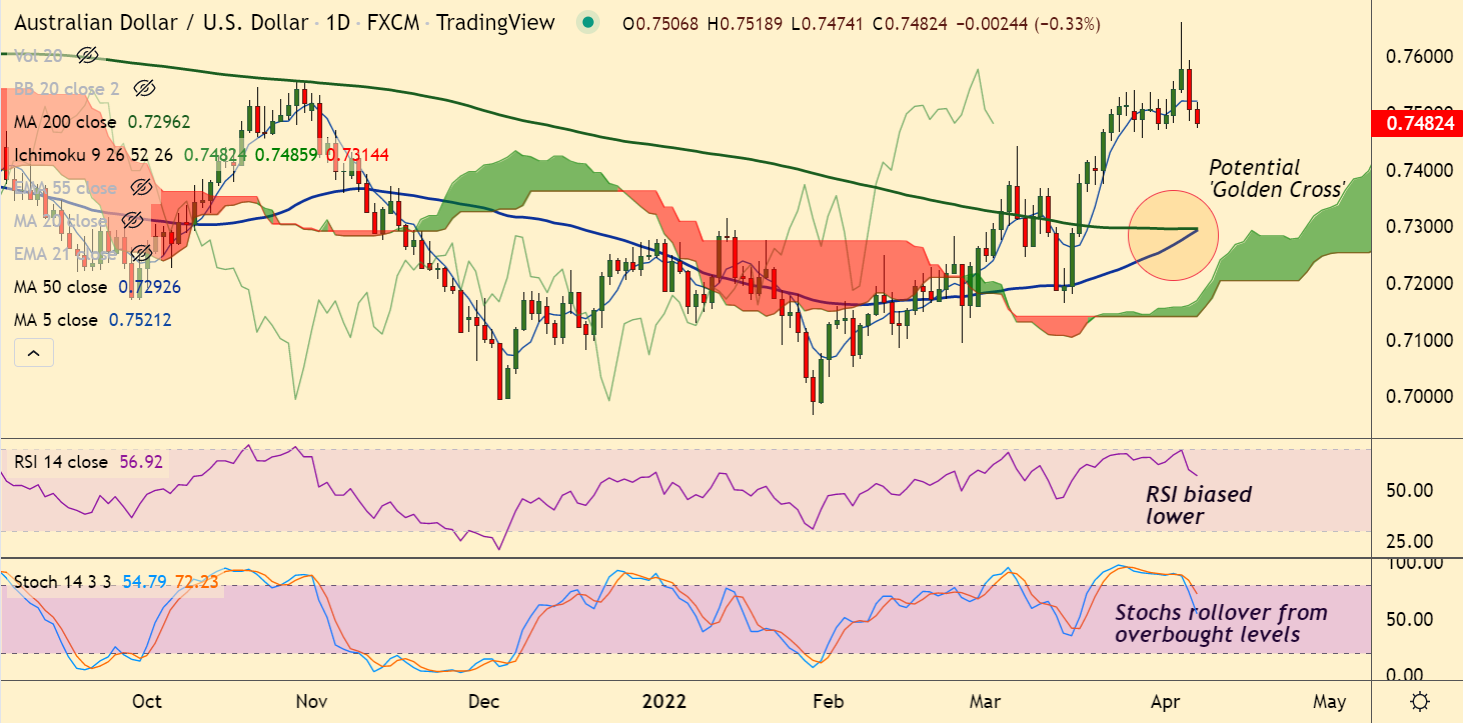 Summary: AUD/USD was trading with a bearish bias. Price action was rejected at 110-month EMA. Dip till 21-EMA at 0.7445 likely.