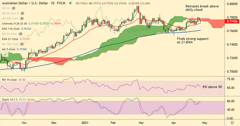 Technical indicators show minor weakness in the pair. Strong supports are aligned at 21-EMA at 0.7713 and 55-EMA at 0.7693.