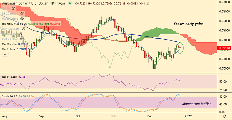 5-DMA is immediate support at 0.7208, breach below will see dip till 21-EMA at 0.7180. Bullish invalidation likely below 200-week MA at 0.7175.